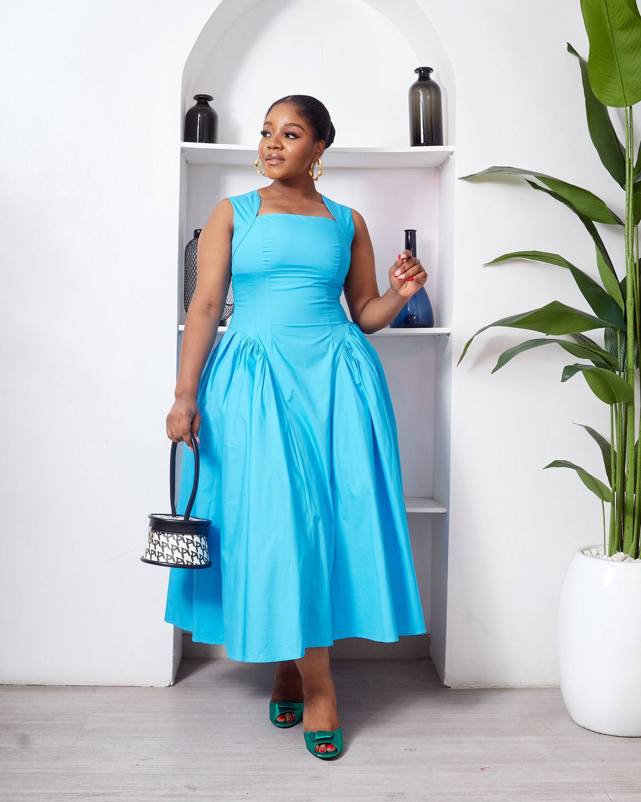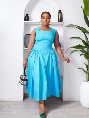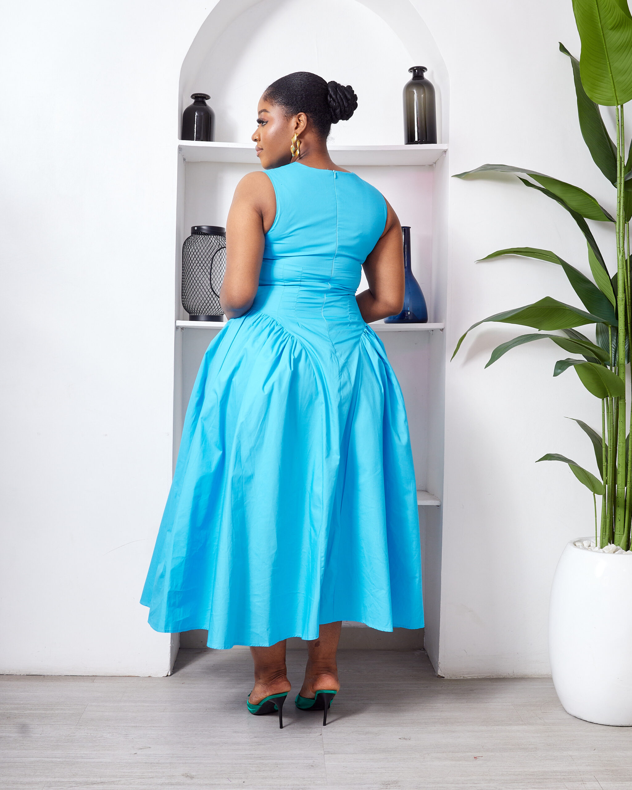 BLUE COTTON ELEGANT PRINCESS DOLL MIDI DRESS