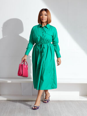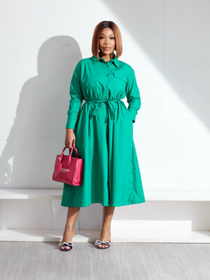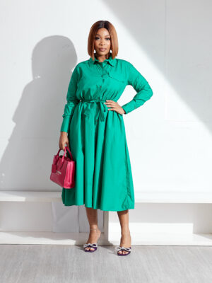 OOS GREEN ONE POCKET PUSSYBOW SWING SHIRT DRESS