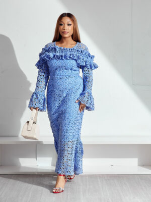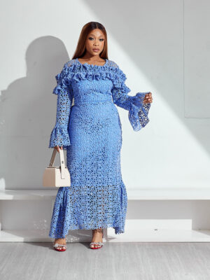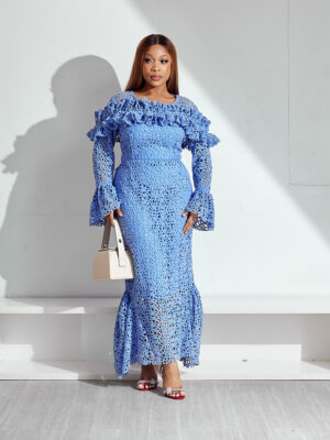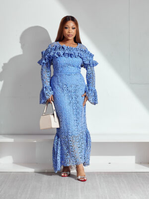 Home Clothing Dresses (2FOR40K) SASHES X HIDES BLUE GUIPURE FLORAL CUT WITH FRILL CHEST FLARE HEM SLEEVES MIDI DRESS