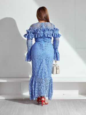 (2FOR40K) SASHES X HIDES BLUE GUIPURE FLORAL CUT WITH FRILL CHEST FLARE HEM SLEEVES MIDI DRESS