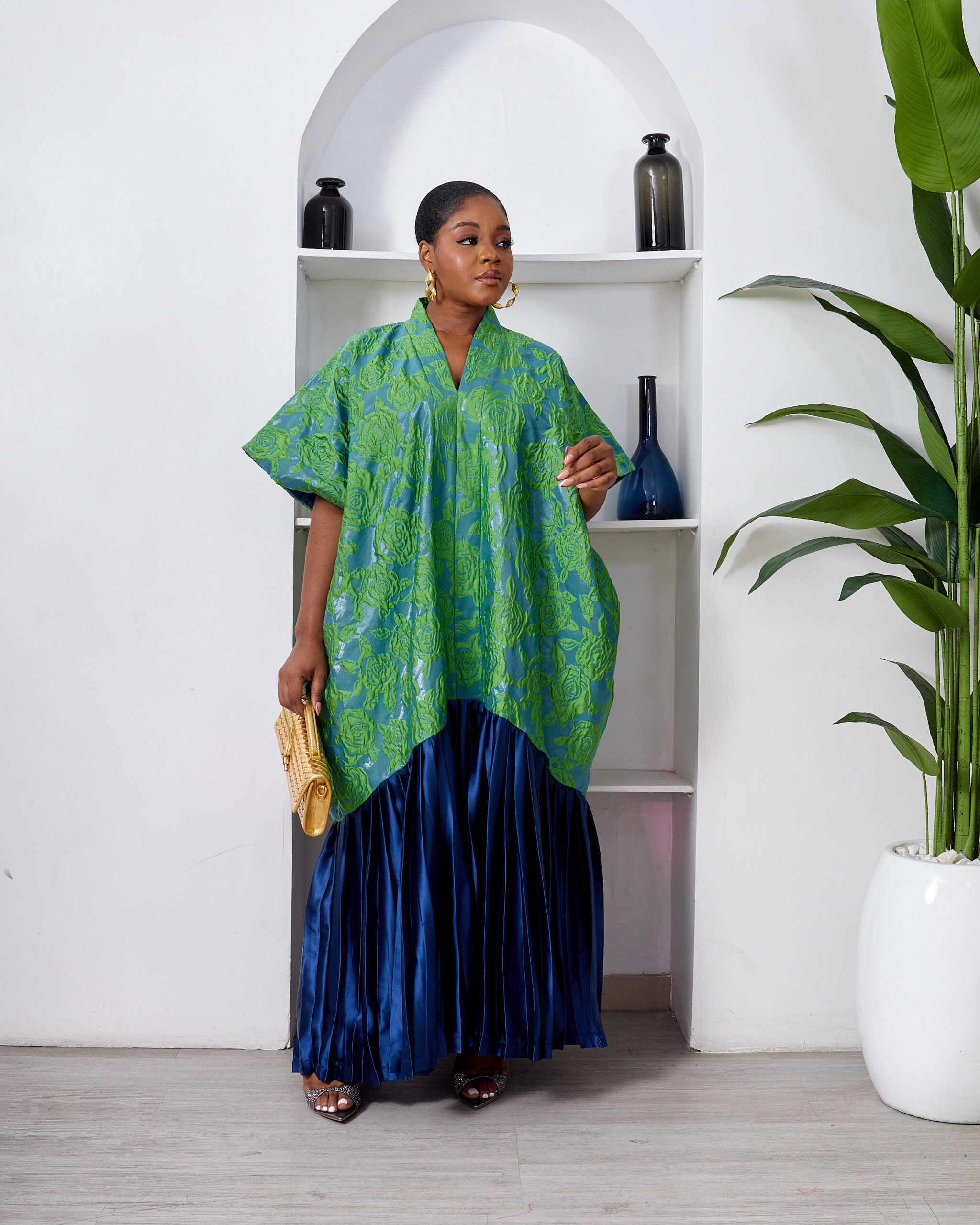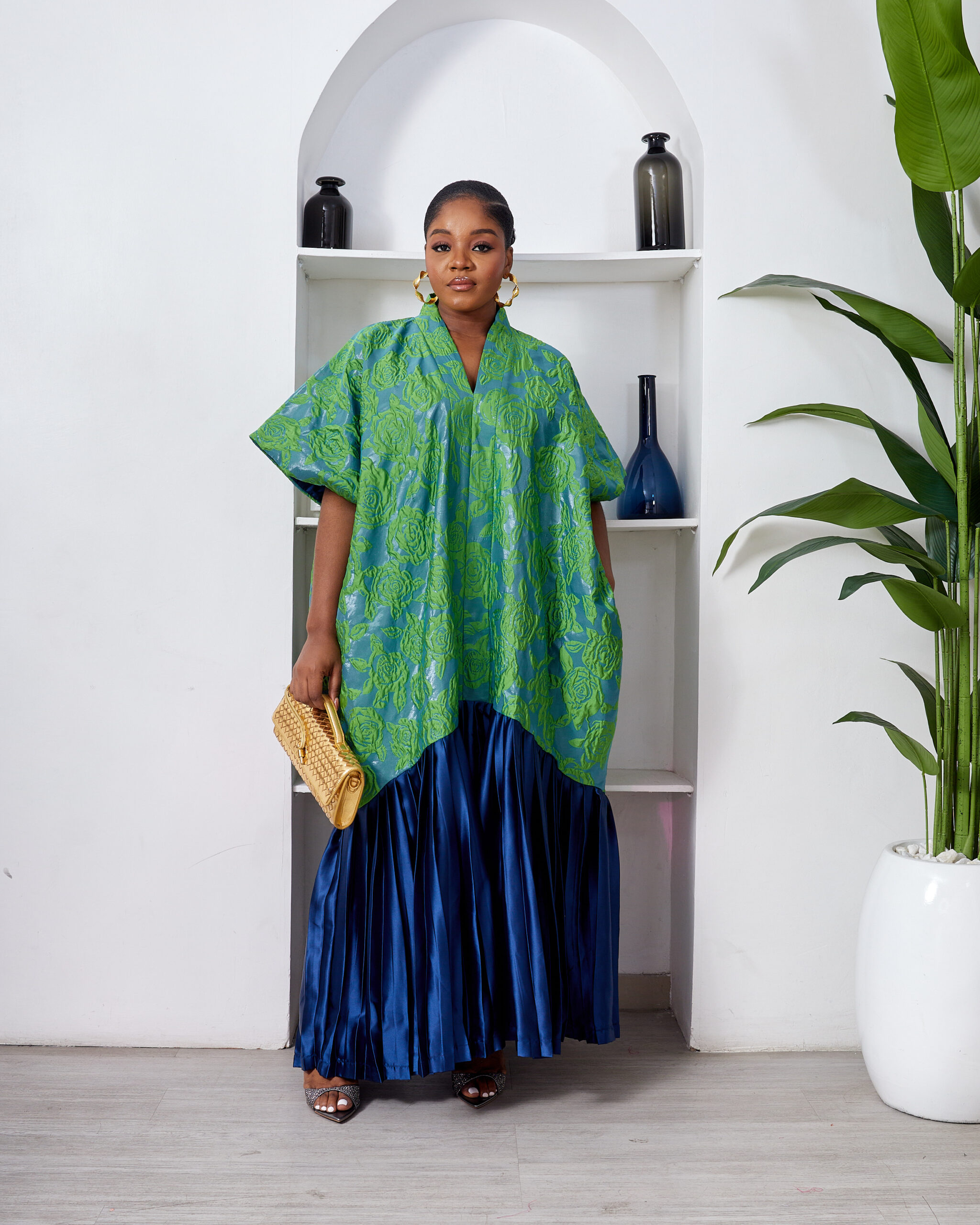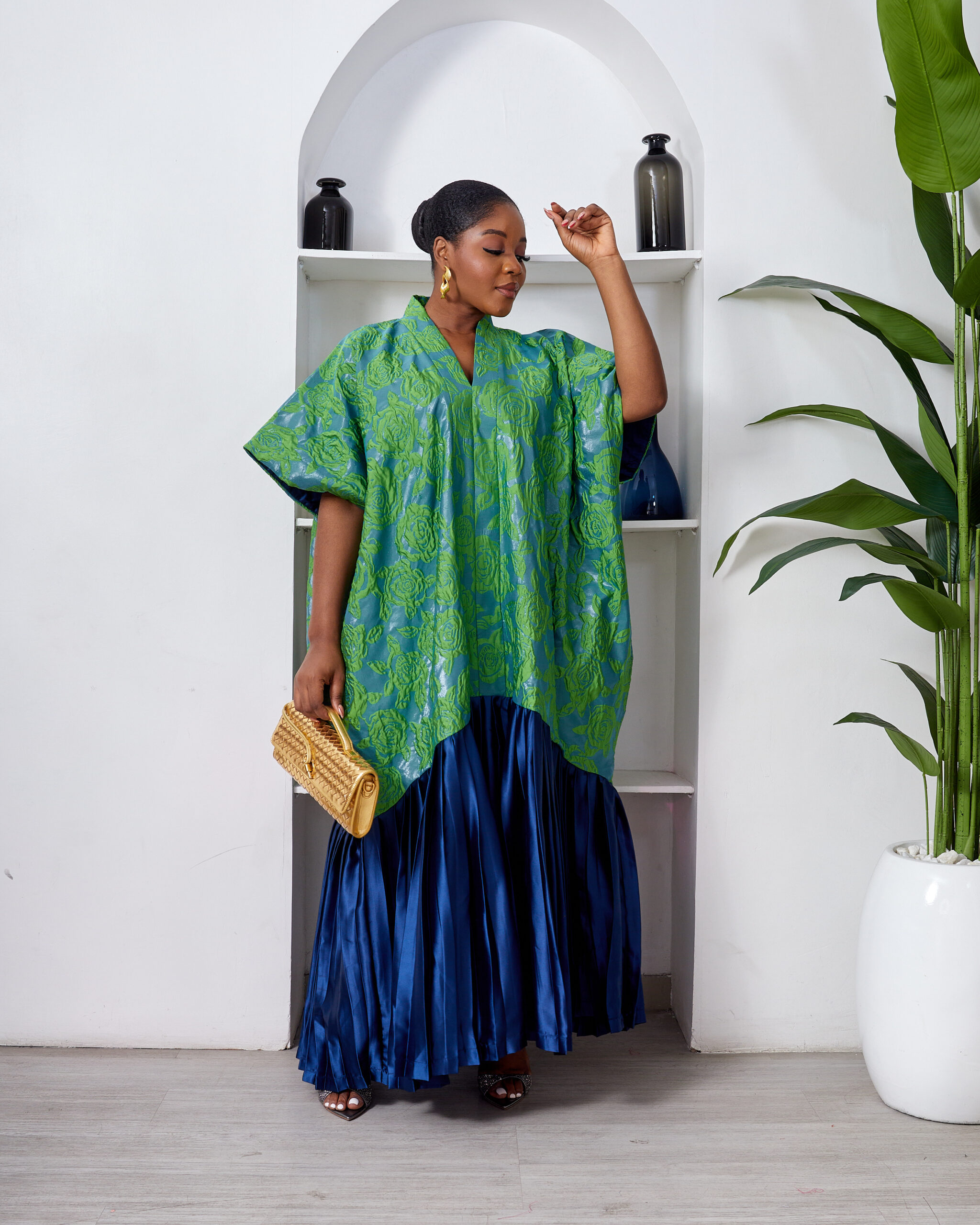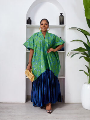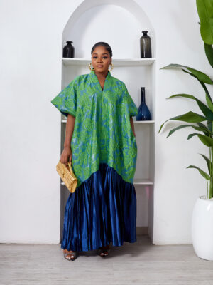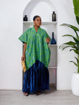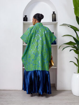 SASHES X HIDES GREEN X MARL EMBOSSED FLORAL BROCADE NAVY SILK PLEATED HEM CAFTAN