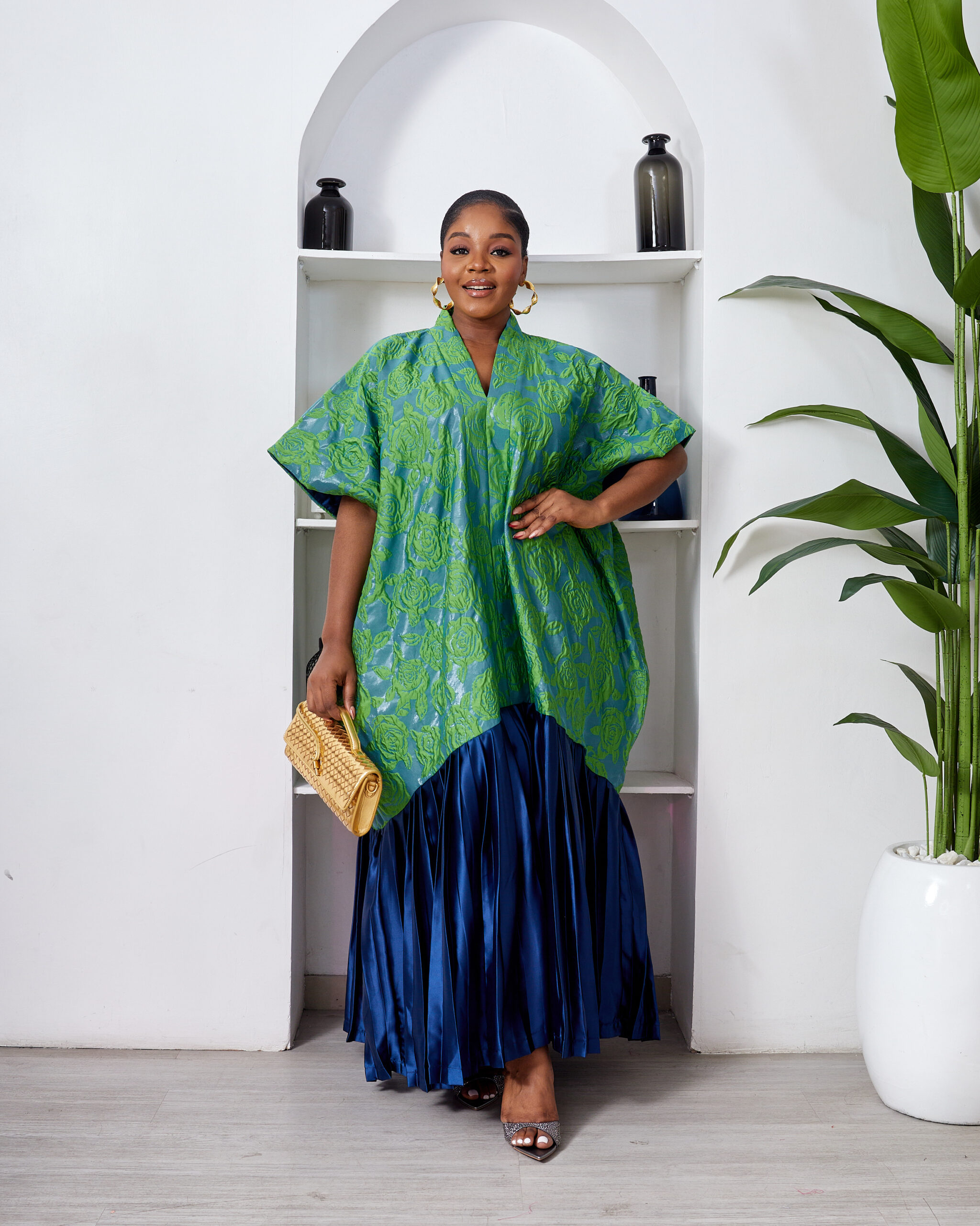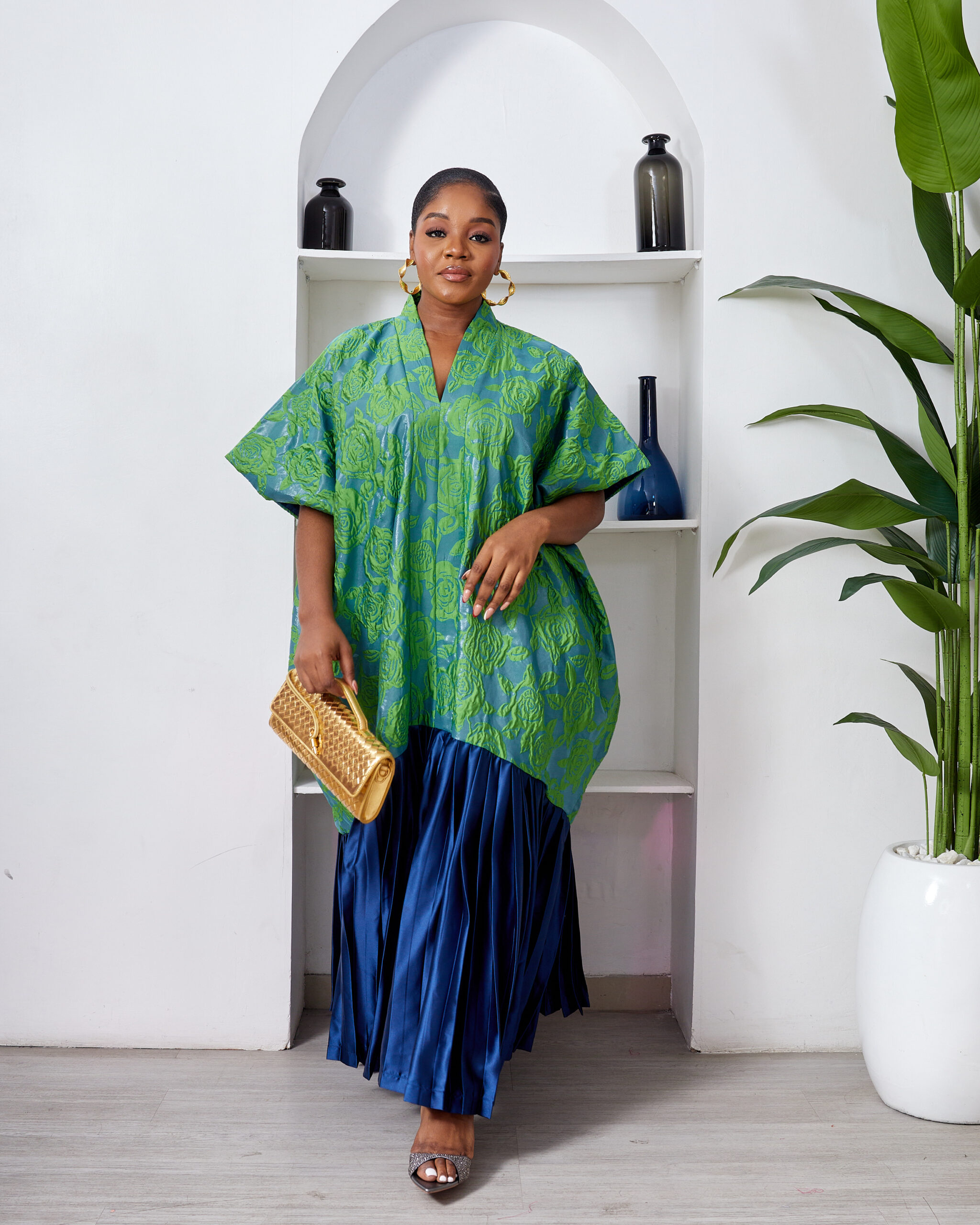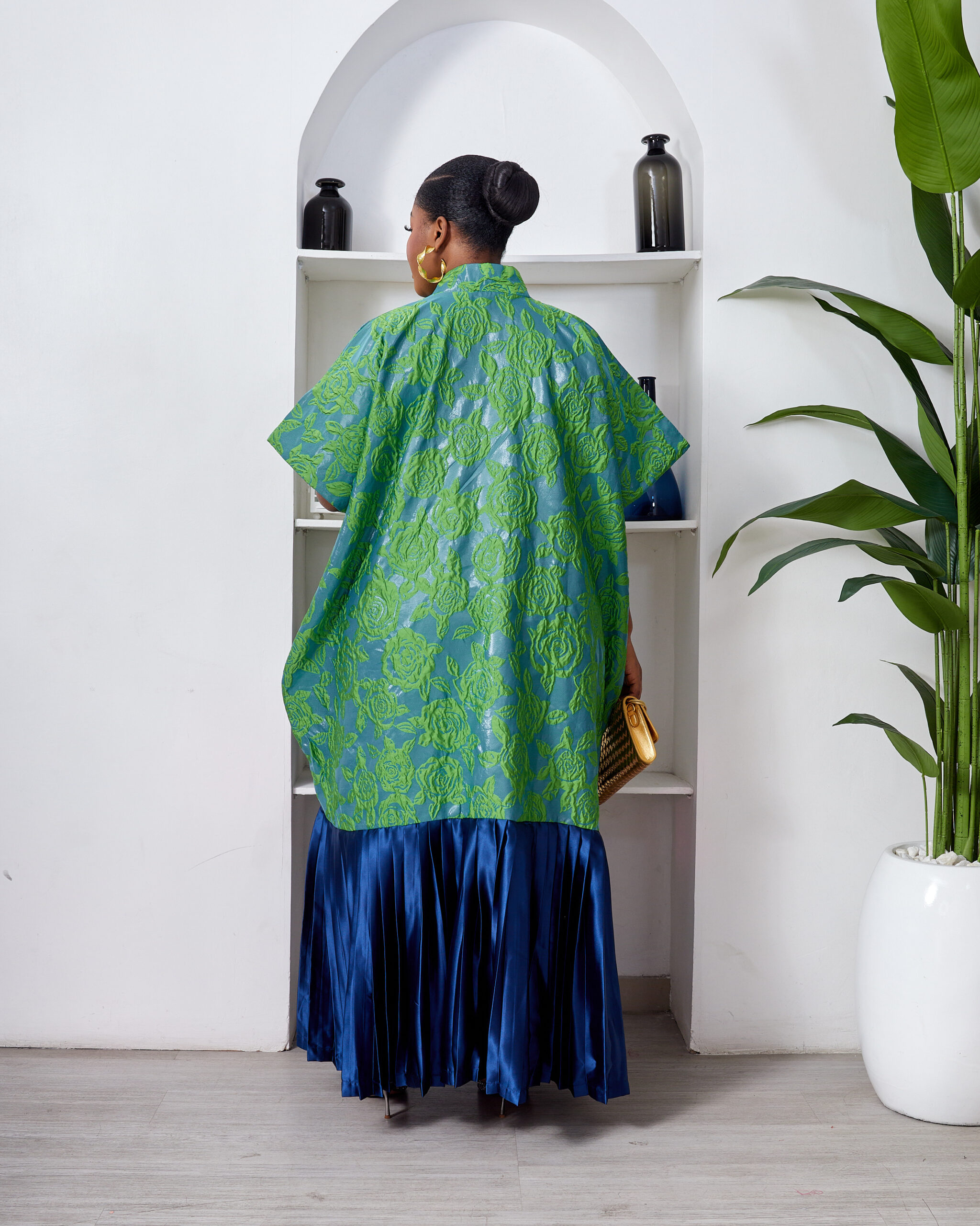 SASHES X HIDES GREEN X MARL EMBOSSED FLORAL BROCADE NAVY SILK PLEATED HEM CAFTAN