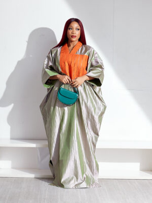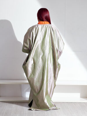 | SASHES X HIDES SILVER BROCADE WITH ORANGE LAZERCUT ASOOKE PATCH CAFTAN |